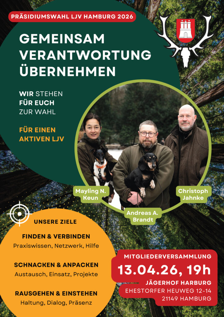 Wir haben uns daher entschlossen, auch den Landesjagdverband Hamburg um Unterstützung zu bitten und haben deswegen als Jägergruppe einen Antrag zur nächsten Mitgliederversammlung gestellt, mit dem unsere Position auch gegenüber Behörden, Gerichten und der Gesetzgebung bekräftigt werden soll.